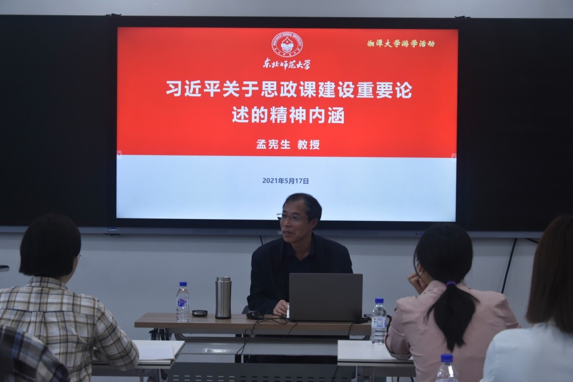 随后,孟宪生教授开展了题为“习近平关于思政课建设重要论述的精神内涵”的讲座。他将习近平总书记在学校思想政治理论课教师座谈会上的重要讲话精神概括为“守正创新”、“大中小思政课一体化”、“思政课队伍建设”三个核心内容,并结合当前我国思政课建设的现状及问题对这三个核心内容进行了详细诠释。