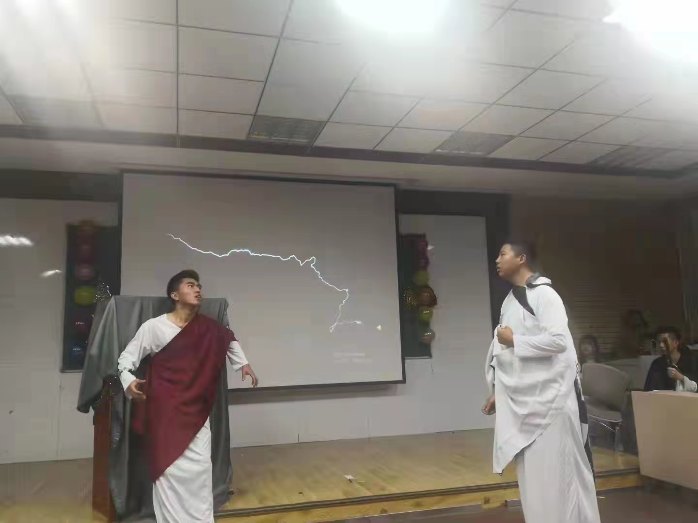 18日晚的哲学节庆祝晚会上,师生不仅表演了精彩的文艺节目,还进行了游戏和抽取购书卡等活动互动,毕业学生则通过视频表达了对母校师生的祝福。哲学日最为期待的依然是学生们自编自演的哲学戏剧。本次戏剧主题是“普罗米修斯”,演员们通过精彩的表演展现了普罗米修斯为人类盗取火种而不惜牺牲自己的伟大精神,成功掀起了本届哲学节晚会的高潮。