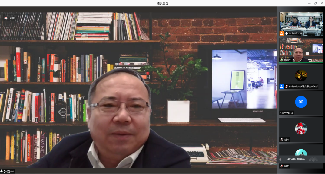韩喜平教授围绕马克思主义的“科学性、真理性、人民性、实践性、开放性、时代性”生动地阐释了马克思主义的强大生命力。习近平总书记曾提出“要科学认识马克思主义理论,马克思主义是科学的理论,是实践的理论,是人民的理论,是不断发展的理论。”党的百年奋斗史就是一部马克思主义的科学性和真理性得到充分检验、人民性和实践性得到充分贯彻、开放性和时代性得到充分彰显的历史。他强调,马克思主义是实践的理论、发展的理论,根据时代的变化,总结新的实践经验,进行理论创新是马克思主义的应有之义。要坚持以马克思主义为指导,推进中华民族伟大复兴新征程。
