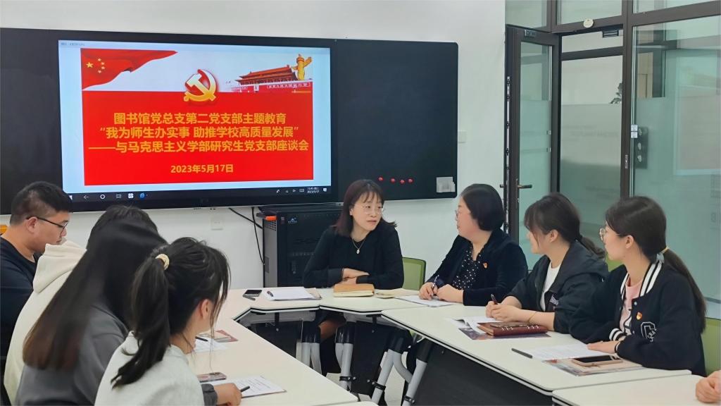 2022级研究生党支部与图书馆党总支第二党支部联合开展“我为师生办实事 助推学校高质量发展”主题教育暨“凝心铸魂学思想,戮力同心助发展”主题党日。共有近30名教工党员和学生党员参加此次活动,图书馆党总支书记郝明宇出席此次活动,并做主题发言。活动由图书馆党总支第二党支部书记陈红岩主持。