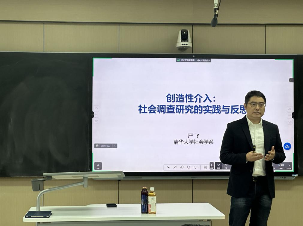 229报告厅举行。教育部青年长江学者严飞教授以“创造性介入:社会调查研究的实践与反思”为题,向同学们介绍自己在社会调查研究过程中的一些实务性的田野经历和理论性的反思。严飞老师是清华大学社会学系副教授、副系主任,博士生导师,《清华社会学评论》执行主编,国家级奖励计划获得者,同时兼任中国社会学会理事、中国社会学会文化社会学专业委员会副理事长、中国社会学会学术传播专业委员会副秘书长。主要研究领域包括历史社会学、政治社会学、转型社会学,在SSCI、CSSCI等重要学术期刊发表论文百余篇,著有《悬浮:异乡人的都市生存》《穿透:像社会学家一样思考》等。本场讲座由社会学院院长刘迟教授主持,社会学院党支部书记朱兴涛进行了评议和总结。