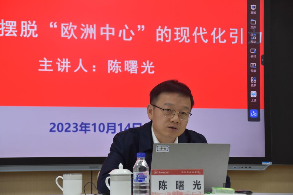 陈曙光教授以“中国何以摆脱‘欧洲中心’的现代化引力”为题,结合马克思的世界历史理论和中国近现代历史的发展,深刻剖析了中国开辟中国式现代化新道路的内在逻辑和深层原因,着重探讨了中国式现代化的重大影响及其世界历史性意义。