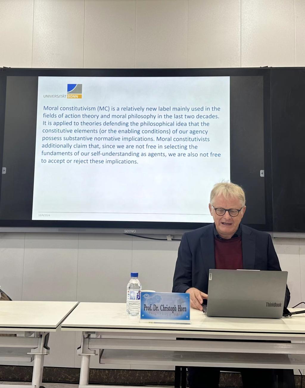 在主旨发言阶段,Horn教授展现了当代道德构成主义的最新研究成果,重点对克里斯蒂娜·科斯嘉德的道德构成主义进行了批判性研究,最后得出一种亚里士多德式的幸福价值论。首先,Horn教授对道德构成主义进行了简要介绍,聚焦于科斯嘉德的道德构成主义版本。Horn教授认为尽管科斯嘉德的模型在描述个人身份方面具有吸引力,但它过分强调自我同一性,忽略了理性行动者幸福结构的构成性特征;其次,Horn教授基于古典目的论行动理论对构成主义进行修正,强调行动者总是必须从善的角度来看待他们的实际选择,并认为实践目的必须始终具有内在价值;最后,Horn教授通过探讨道德善的优先性问题指出了科斯嘉德道德构成主义的不充分性。