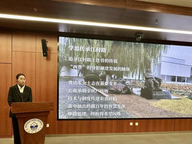 汇报过程中,覃继崟同学展示了题为《江村诗旅》的诗歌朗诵表演,将师生们的思绪拉到了美丽的江村,体现了其与江村建立的深厚情感联系。