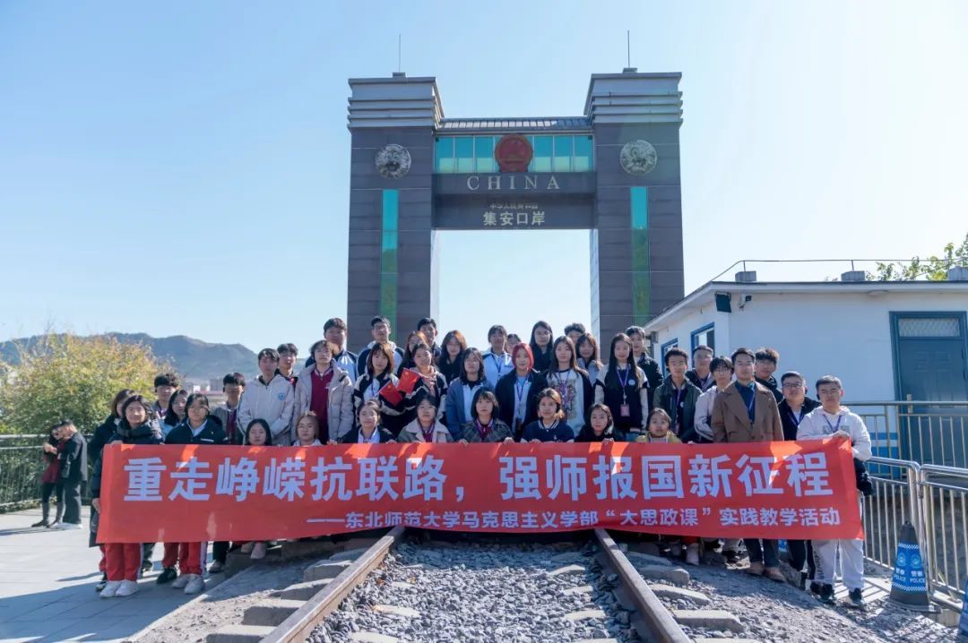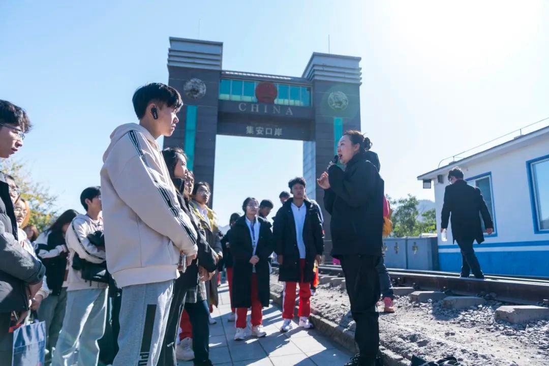 随后,师生来到集安市国门公路桥。当他们站上四楼观景台远眺时,鸭绿江宛如一条碧绿丝带静静流淌,江对面的朝鲜第六大城市满浦清晰映入眼帘。此时,现场教学《走进国门(口岸)看中国开放发展之路》正式开启。眼前之景,兼具历史的厚重感与时代的活力气息。从往昔的边境口岸发展成为如今中国开放发展的关键窗口,这里见证了国家的崛起与进步历程。集安市国门公路桥,恰似一座连接过去与未来的桥梁,使师生深切体会到国家开放发展的坚毅决心和辉煌成就,更深刻领悟到“中国共产党为什么能,中国特色社会主义为什么好,归根到底是因为马克思主义行!”的真理内涵。