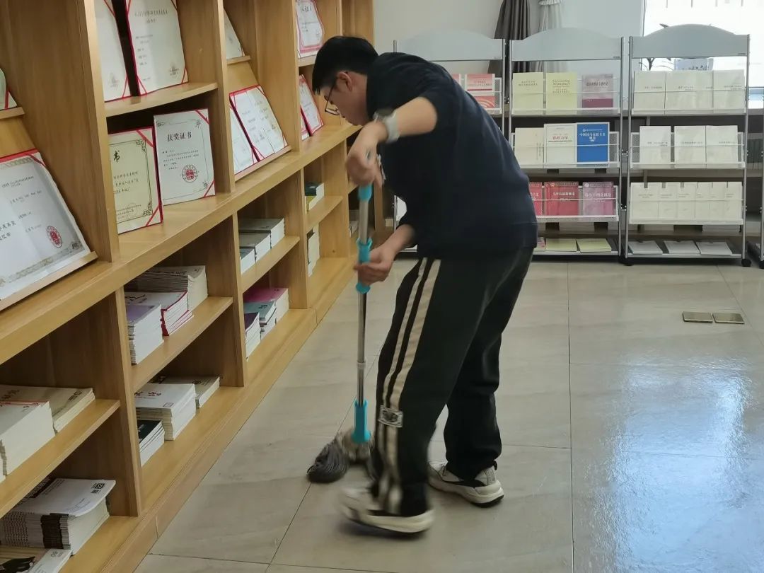 资料室和党建活动室的卫生、擦拭玻璃,努力营造更为整洁舒适的学习与学生活动环境,以实际行动践行着为师生办实事的承诺。尽管正值深秋微寒天气,但丝毫未影响同学们为师生服务的热情。