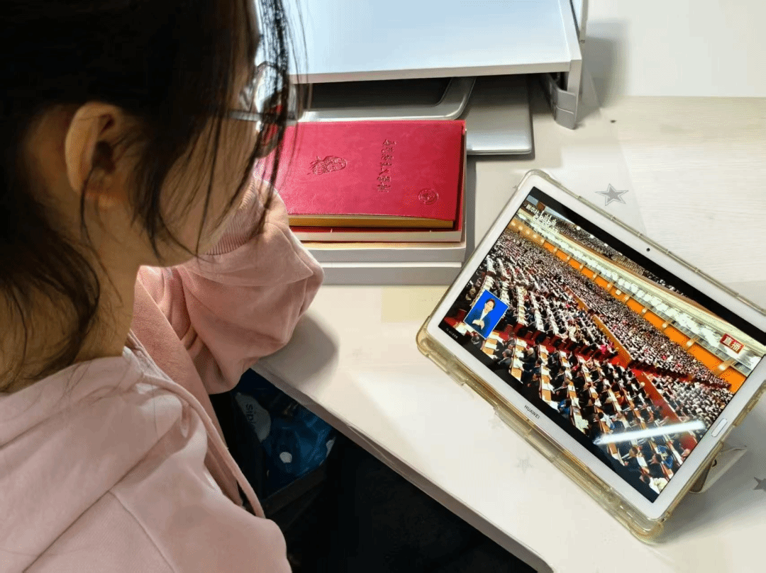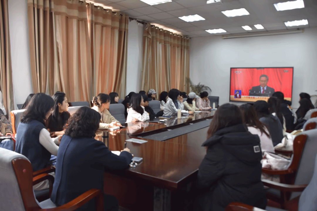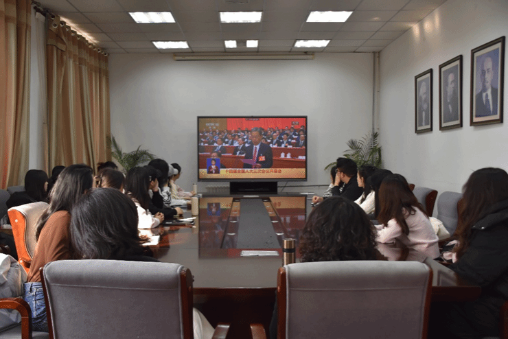 323会议室集中学习收看两会开幕直播。同学们结合自己的专业学习,围绕政府工作报告,开展广泛的学习讨论。
