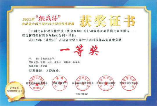 研究生张薇等同学的作品《中国式农村现代化背景下资金互助社的行动策略及动员模式调研报告》,在吉林省“挑战杯”大学生课外学术科技作品竞赛中荣获一等奖。