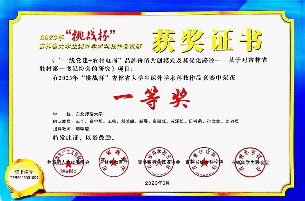 本科生王丫等同学的作品《“一线党建+农村电商”品牌价值共创模式及其优化路径——基于对吉林省驻村第一书记协会的研究》,在吉林省“挑战杯”大学生课外学术科技作品竞赛中荣获一等奖。