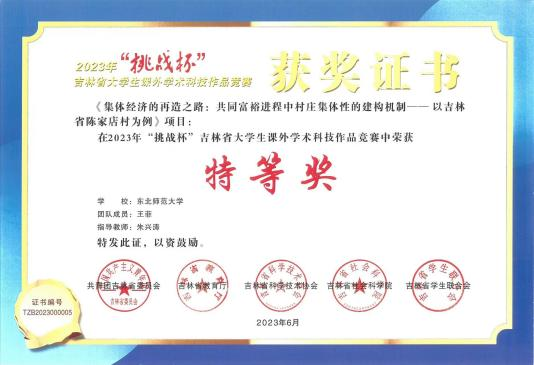 本科生王菲等同学的作品《集体经济的再造之路:共同富裕进程中村庄集体性的建构机制》,在吉林省“挑战杯”大学生课外学术科技作品竞赛中荣获特等奖。